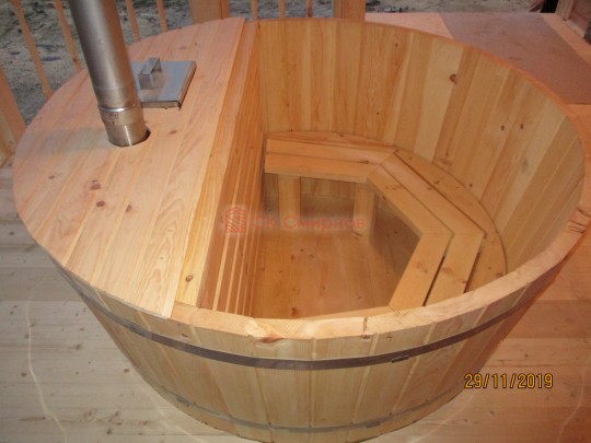 Купель расчитана на 3-4 человека. Оснащена погружной печью и тентом. Нагревается за 3 часа, остывает примерно 5 часов.