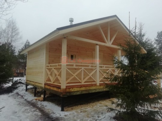 Сам проект стал топовым в 2020 году. Выносная терраса 12 кв.м. под общей двускатной крышей выглядит очень уютно — перекрёстные балки сверху не только распределяют нагрузку на крышу, но и великолепно вписываются в общий дизайн бани. Крышу поддерживают мощные брусовые столбы с домкратиками для регулировки уровня. Если сруб даст усадку, то можно просто выставить нужный уровень — и никаких перекосов.