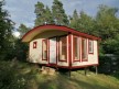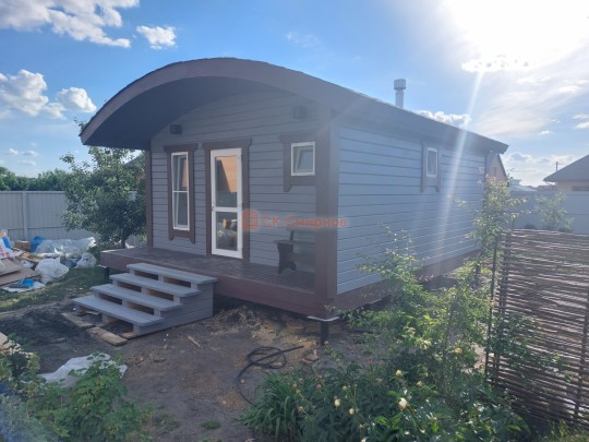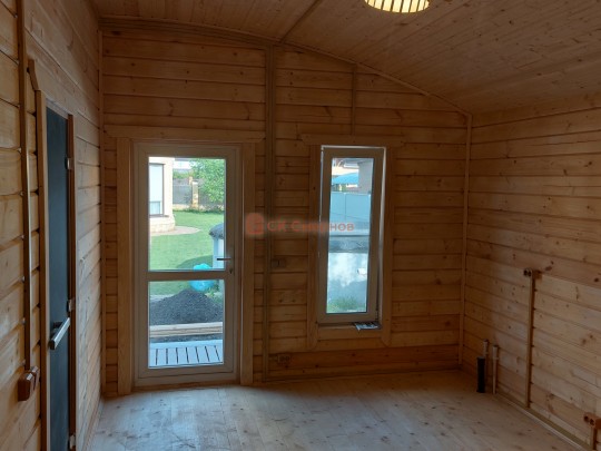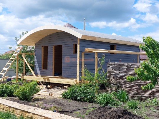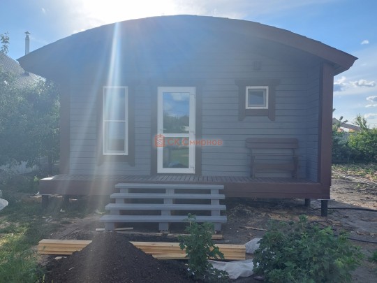 Авторские проект одноэтажной бани «Шале» с необычной округлой крышей, высокими панорамными окнами и небольшой террасой. Такую баню можно построить только из сухого или клееного профилированного бруса в комплектации под ключ. Из бруса естественной влажности и под усадку построить НЕВОЗМОЖНО.