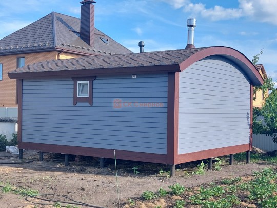 Размер 5,3 на 6 метров. Внутри 4 помещения: комната отдыха, парная, душ и санузел, где размещается душевая система. Ориентировочный срок строительства 10 дней.
