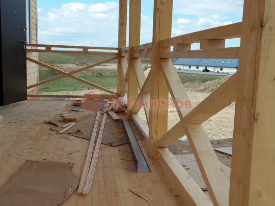 На террасе при условии что она есть делаем перила из строганной доски со всех сторон, столбы террасные также строганные, а не обрезки профилированного бруса с шипом и пазом. Домкратики на столбах для дальнейшей регулировки. Балясины будут сделаны аккуратно. Обратите внимание что в дешёвых случаях это может быть и будет просто вагонка прибирая к неотесанной доске снаружи и столбы будут не квадратные а просто профилированный брус как на видео.