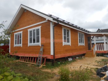 Из профилированного клееного бруса 9х14см, 14х14 см или 14х19 см. Сборка сруба в теплый угол на нагеля или гвозди 200 мм со сверлением отверстия в верхнем брусе (в зависимости от вида бруса).