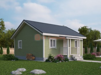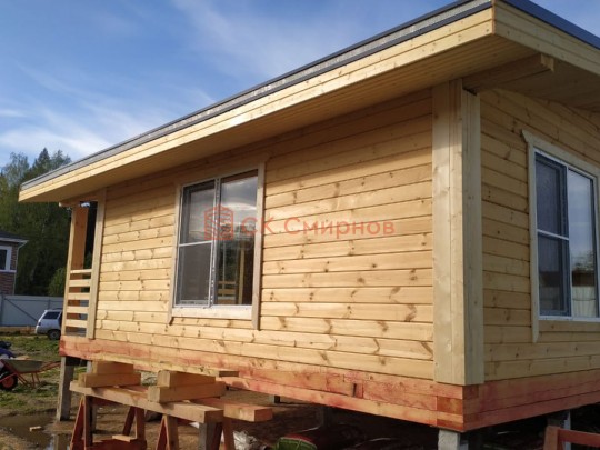 В мае 2020 мы завершили строительство дачного дома из бруса 7 на 9 метров по современному проекту с разноуровневой двускатной крышей. Дом небольшой, но планировка продумана хорошо. На 63 квадратных метрах поместились тамбур, прихожая, две спальни, кухня-гостиная и санузел. Есть большая открытая терраса. Ничего лишнего — все помещения функциональны и неизбыточны.