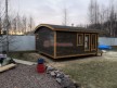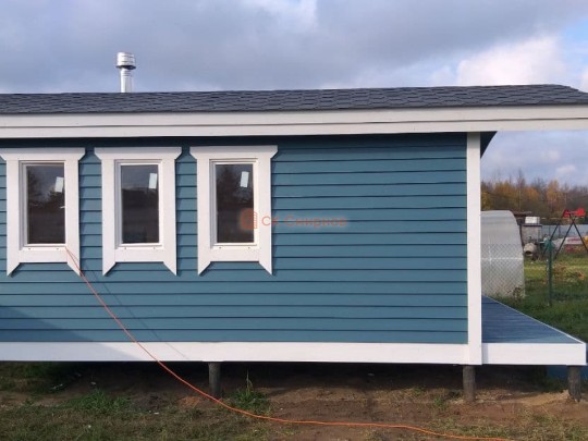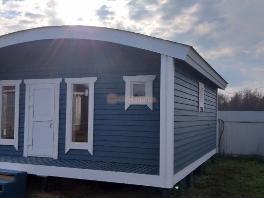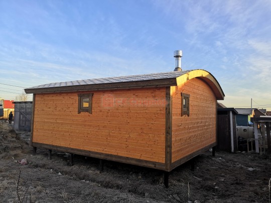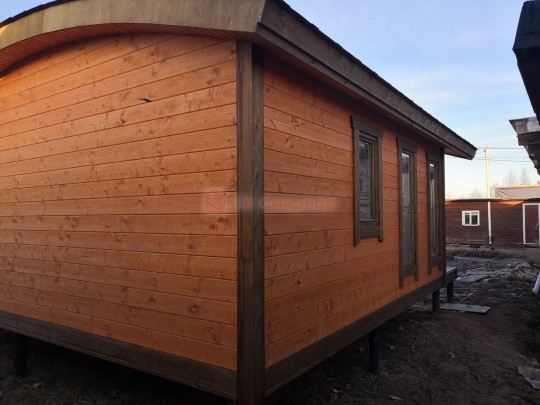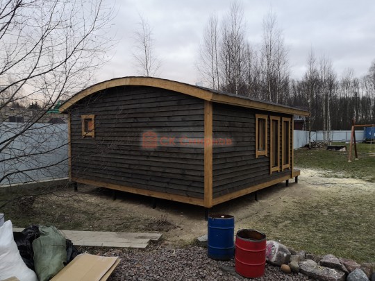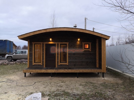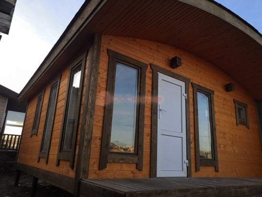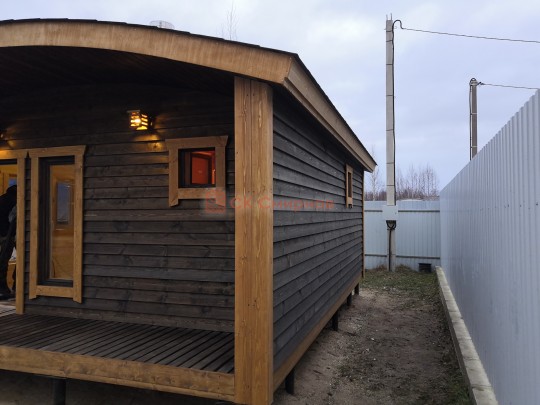 Бани подобного типа мы строим как по каркасной технологии с утеплением и обшивкой доской внахлёст, так и из клееного или сухого бруса. В обоих случаях качество сборки превосходное: баня тёплая, надёжная и очень красивая.