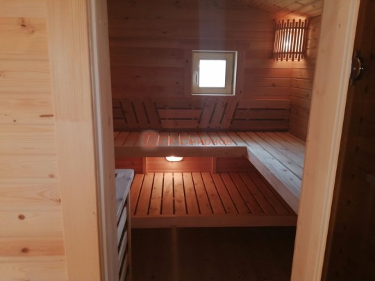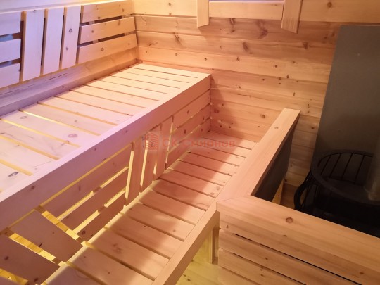 В комплект бани входит стол и две скамейки из доски 19мм, как на фото. Есть комплекты из более толстой доски а также из кедра, смотрите в доп комплектации.