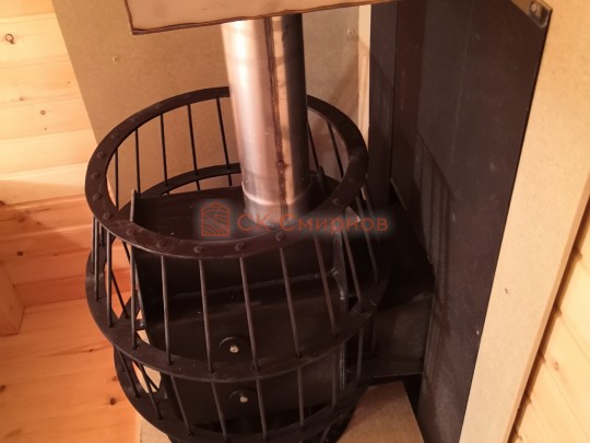 Установка печи Теплодар Русь сетка 12 л панорама ( со стеклянной дверцей ), трубы сэндвич, проходы и зонт входят в стоимость бани. Экран металлический через стену. На полу кладется кирпич, базальтовый картон, минерит. На стенах базальтовый картон, минерит, через втулки прикручивается минерит. Ссылка на сайт производителя https://www.teplodar.ru/catalog/detail/rus_setka_12_l_panorama/